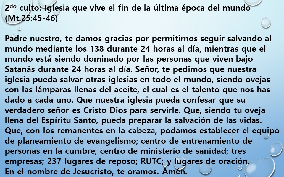 Señor, te pedimos que nuestra iglesia pueda salvar otras iglesias en todo el mundo, siendo ovejas con las lámparas llenas del aceite, el cual es el talento que nos has dado a cada uno. Que nuestra iglesia pueda confesar que su verdadero señor es Cristo Dios para servirle. Que, siendo tu oveja llena del Espíritu Santo, pueda preparar la salvación de las vidas. Que, con los remanentes en la cabeza, podamos establecer el equipo de planeamiento de evangelismo; centro de entrenamiento de personas en la cumbre; centro de ministerio de sanidad; tres empresas; 237 lugares de reposo; RUTC; y lugares de oración.