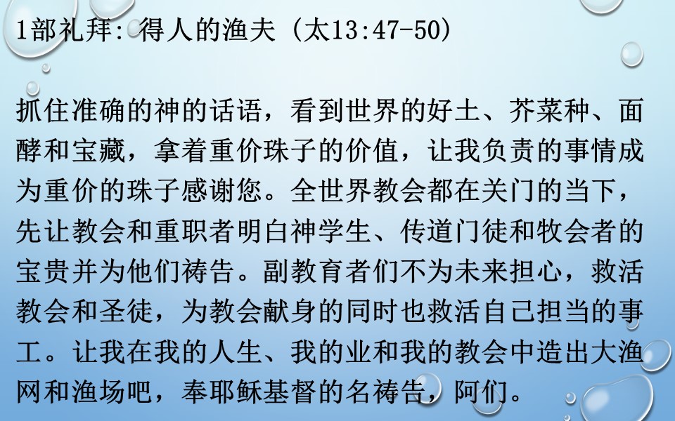 抓住准确的神的话语,看到世界的好土、芥菜种、面酵和宝藏,拿着重价珠子的价值,让我负责的事情成为重价的珠子感谢您。全世界教会都在关门的当下,先让教会和重职者明白神学生、传道门徒和牧会者的宝贵并为他们祷告。副教育者们不为未来担心,救活教会和圣徒,为教会献身的同时也救活自己担当的事工。让我在我的人生、我的业和我的教会中造出大渔网和渔场吧,奉耶稣基督的名祷告,阿们。