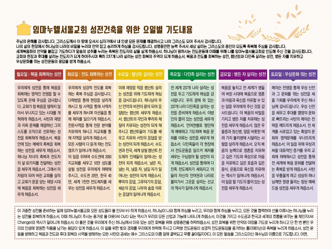 임마누엘서울교회 성전건축을 위한 요일별 기도내용