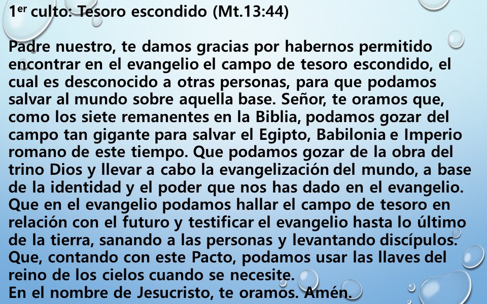 Padre nuestro, te damos gracias por habernos permitido encontrar en el evangelio el campo de tesoro escondido, el cual es desconocido a otras personas, para que podamos salvar al mundo sobre aquella base.