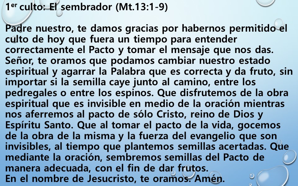 Señor, te oramos que podamos cambiar nuestro estado espiritual y agarrar la Palabra que es correcta y da fruto, sin importar si la semilla caye junto al camino, entre los pedregales o entre los espinos. Que disfrutemos de la obra espiritual que es invisible en medio de la oración mientras nos aferremos al pacto de sólo Cristo, reino de Dios y Espíritu Santo. Que al tomar el pacto de la vida, gocemos de la obra de la misma y la fuerza del evangelio que son invisibles, al tiempo que plantemos semillas acertadas. Que mediante la oración, sembremos semillas del Pacto de manera adecuada, con el fin de dar frutos.