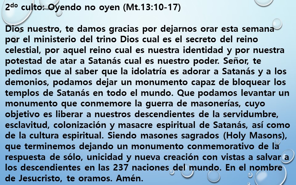 Señor, te pedimos que al saber que la idolatría es adorar a Satanás y a los demonios, podamos dejar un monumento capaz de bloquear los templos de Satanás en todo el mundo. Que podamos levantar un monumento que conmemore la guerra de masonerías, cuyo objetivo es liberar a nuestros descendientes de la servidumbre, esclavitud, colonización y masacre espiritual de Satanás, así como de la cultura espiritual. Siendo masones sagrados (Holy Masons), que terminemos dejando un monumento conmemorativo de la respuesta de sólo, unicidad y nueva creación con vistas a salvar a los descendientes en las 237 naciones del mundo.