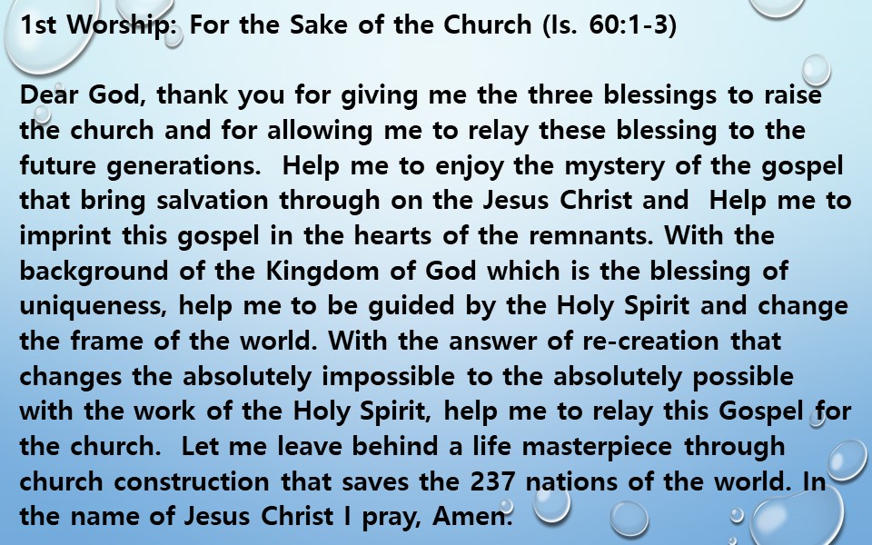 Dear God, thank you for giving me the three blessings to raise the church and for allowing me to relay these blessing to the future generations.  Help me to enjoy the mystery of the gospel that bring salvation through on the Jesus Christ and  Help me to imprint this gospel in the hearts of the remnants. With the background of the Kingdom of God which is the blessing of uniqueness, help me to be guided by the Holy Spirit and change the frame of the world. With the answer of re-creation that changes the absolutely impossible to the absolutely possible with the work of the Holy Spirit, help me to relay this Gospel for the church.  Let me leave behind a life masterpiece through church construction that saves the 237 nations of the world. In the name of Jesus Christ I pray, Amen.