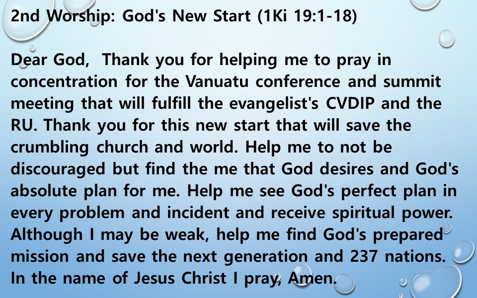 Dear God,  Thank you for helping me to pray in concentration for the Vanuatu conference and summit meeting that will fulfill the evangelist's CVDIP and the RU. Thank you for this new start that will save the crumbling church and world. Help me to not be discouraged but find the me that God desires and God's absolute plan for me. Help me see God's perfect plan in every problem and incident and receive spiritual power. Although I may be weak, help me find God's prepared mission and save the next generation and 237 nations. In the name of Jesus Christ I pray, Amen.