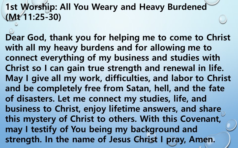 Dear God, thank you for helping me to come to Christ with all my heavy burdens and for allowing me to connect everything of my business and studies with Christ so I can gain true strength and renewal in life. May I give all my work, difficulties, and labor to Christ and be completely free from Satan, hell, and the fate of disasters. Let me connect my studies, life, and business to Christ, enjoy lifetime answers, and share this mystery of Christ to others. With this Covenant, may I testify of You being my background and strength. In the name of Jesus Christ I pray, Amen.