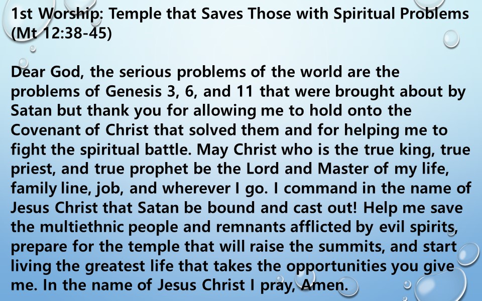 Dear God, the serious problems of the world are the problems of Genesis 3, 6, and 11 that were brought about by Satan but thank you for allowing me to hold onto the Covenant of Christ that solved them and for helping me to fight the spiritual battle. May Christ who is the true king, true priest, and true prophet be the Lord and Master of my life, family line, job, and wherever I go. I command in the name of Jesus Christ that Satan be bound and cast out! Help me save the multiethnic people and remnants afflicted by evil spirits, prepare for the temple that will raise the summits, and start living the greatest life that takes the opportunities you give me. In the name of Jesus Christ I pray, Amen.