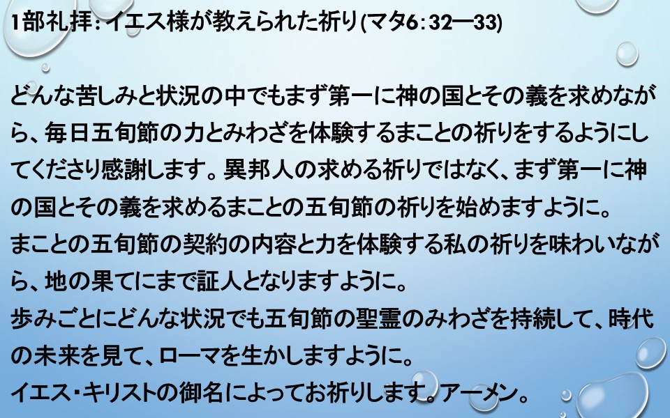 異邦人の求める祈りではなく、まず第一に神の国とその義を求めるまことの五旬節の祈りを始めますように。