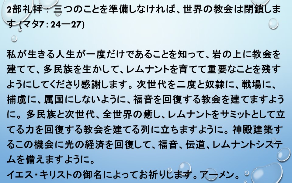 2部礼拝 : 三つのことを準備しなければ、世界の教会は閉鎖します (マタ7:24ー27)
