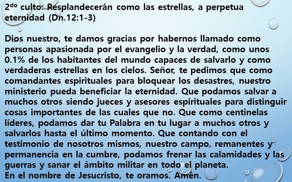 Señor, te pedimos que como comandantes espirituales para bloquear los desastres, nuestro ministerio pueda beneficiar la eternidad. Que podamos salvar a muchos otros siendo jueces y asesores espirituales para distinguir cosas importantes de las cuales que no. Que como centinelas líderes, podamos dar tu Palabra en tu lugar a muchos otros y salvarlos hasta el último momento. Que contando con el testimonio de nosotros mismos, nuestro campo, remanentes y permanencia en la cumbre, podamos frenar las calamidades y las guerras y sanar el ámbito militar en todo el planeta.