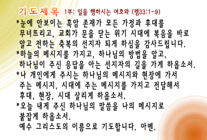 눈에 안보이는 흑암 존재가 모든 가정과 후대를 무너뜨리고, 교회가 문을 닫는 위기 시대에 복음을 바로 알고 전하는 축복의 선지자 되게 하심을 감사드립니다.