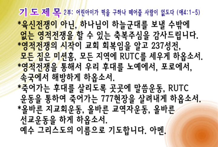 영적전쟁을 통해서 우리 후대를 노예에서, 포로에서, 속국에서 해방하게 하옵소서. 죽어가는 후대를 살리도록 곳곳에 말씀운동, RUTC운동을 통하여 죽어가는 777현장을 살려내게 하옵소서. 올바른 지교회운동, 올바른 교역자운동, 올바른 선교운동을 하게 하옵소서.