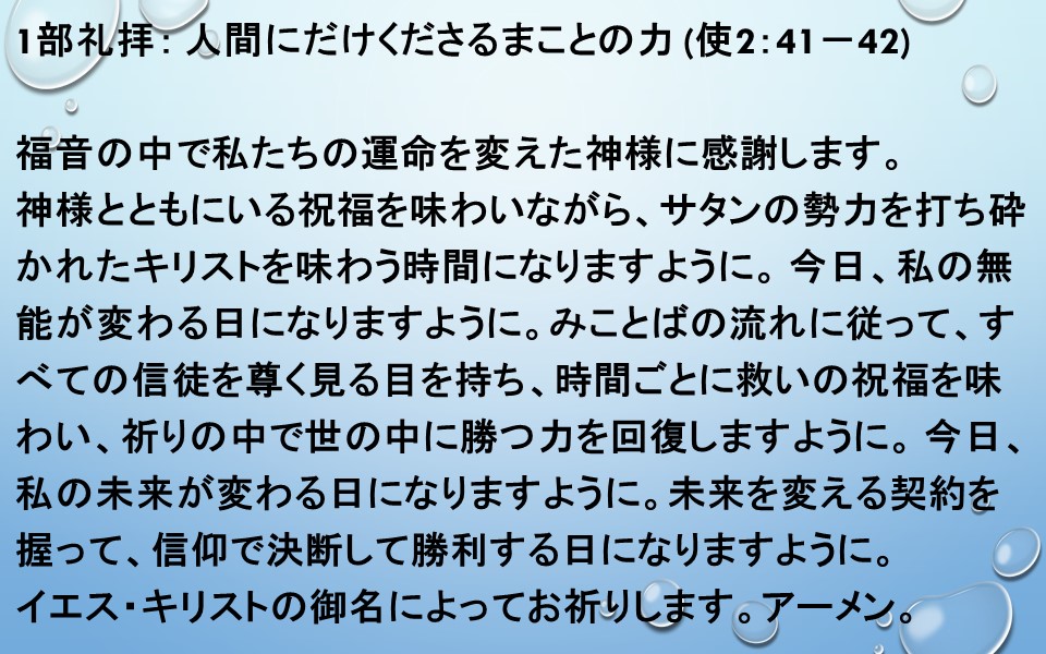 今日、私の無能が変わる日になりますように。みことばの流れに従って、すべての信徒を尊く見る目を持ち、時間ごとに救いの祝福を味わい、祈りの中で世の中に勝つ力を回復しますように。