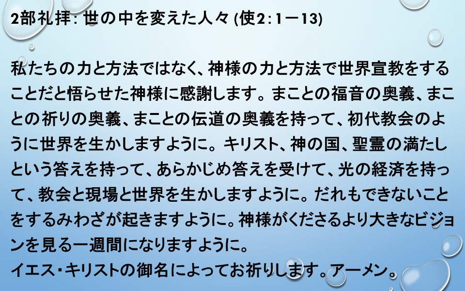 キリスト、神の国、聖霊の満たしという答えを持って、あらかじめ答えを受けて、光の経済を持って、教会と現場と世界を生かしますように。