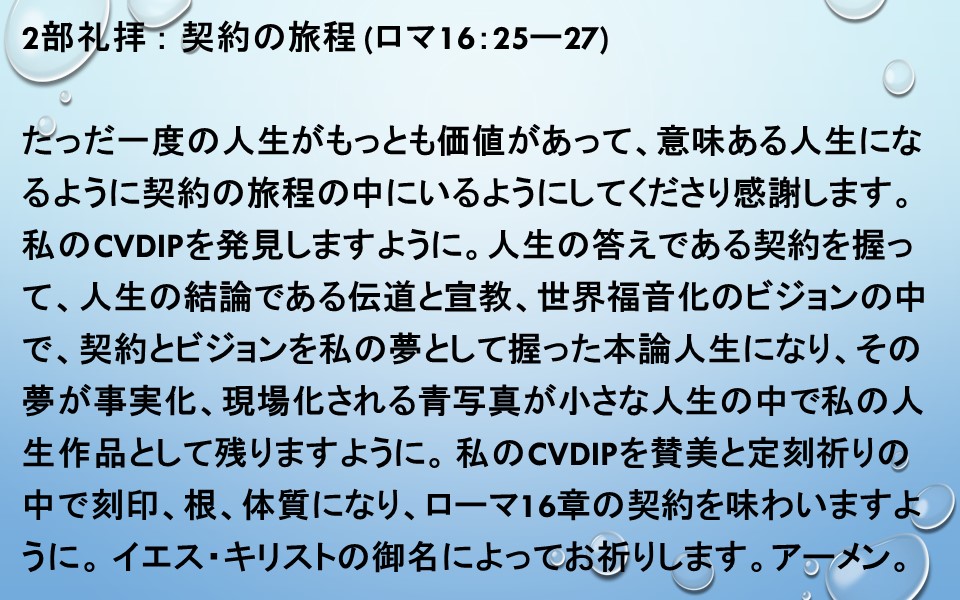 私のCVDIPを発見しますように。人生の答えである契約を握って、人生の結論である伝道と宣教、世界福音化のビジョンの中で、契約とビジョンを私の夢として握った本論人生になり、その夢が事実化、現場化される青写真が小さな人生の中で私の人生作品として残りますように。