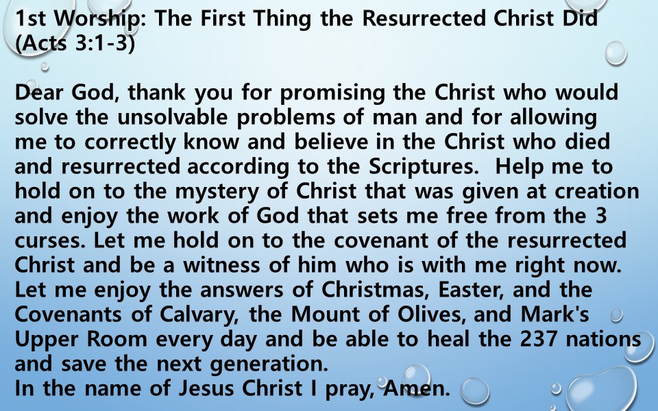 Dear God, thank you for promising the Christ who would solve the unsolvable problems of man and for allowing  me to correctly know and believe in the Christ who died and resurrected according to the Scriptures.  Help me to hold on to the mystery of Christ that was given at creation and enjoy the work of God that sets me free from the 3 curses. Let me hold on to the covenant of the resurrected Christ and be a witness of him who is with me right now. Let me enjoy the answers of Christmas, Easter, and the Covenants of Calvary, the Mount of Olives, and Mark's Upper Room every day and be able to heal the 237 nations and save the next generation. In the name of Jesus Christ I pray, Amen.