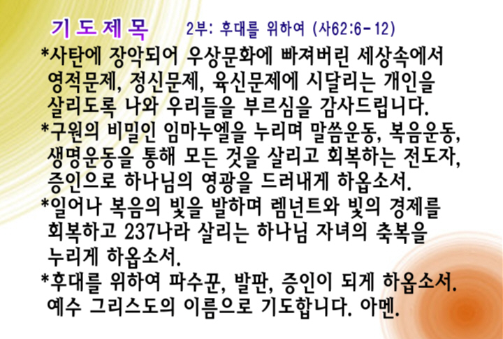 2부 예배: 후대를 위하여 (사62:6-12)