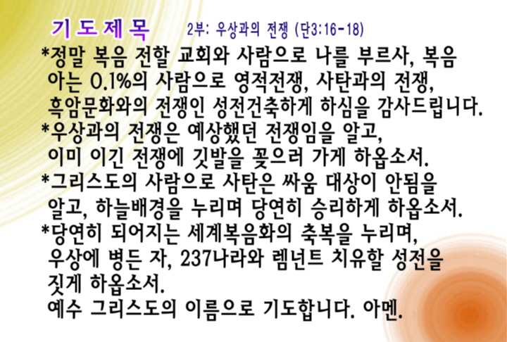 우상과의 전쟁은 예상했던 전쟁임을 알고, 이미 이긴 전쟁에 깃발을 꽂으러 가게 하게 하옵소서.