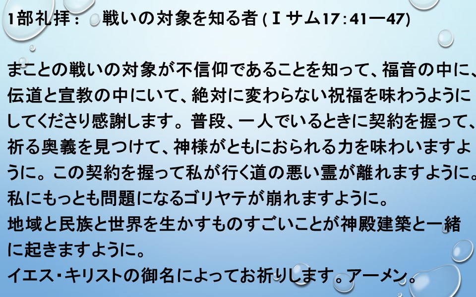 まことの戦いの対象が不信仰であることを知って、福音の中に、伝道と宣教の中にいて、絶対に変わらない祝福を味わうようにしてくださり感謝します。