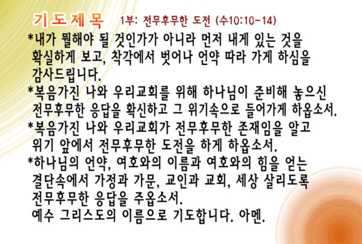 1부 예배: 전무후무한 도전 (수10:10-14)