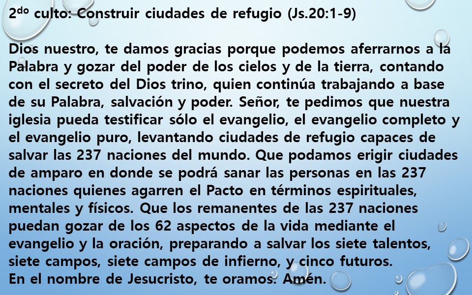 Señor, te pedimos que nuestra iglesia pueda testificar sólo el evangelio, el evangelio completo y el evangelio puro, levantando ciudades de refugio capaces de salvar las 237 naciones del mundo. Que podamos erigir ciudades de amparo en donde se podrá sanar las personas en las 237 naciones quienes agarren el Pacto en términos espirituales, mentales y físicos. Que los remanentes de las 237 naciones puedan gozar de los 62 aspectos de la vida mediante el evangelio y la oración, preparando a salvar los siete talentos, siete campos, siete campos de infierno, y cinco futuros.
