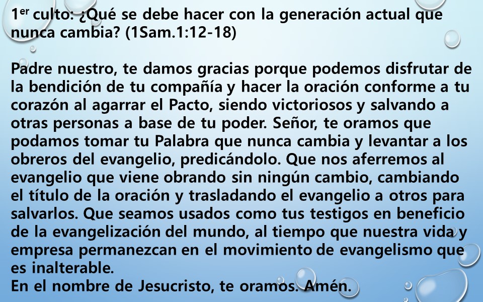 | 1er culto: ¿Qué se debe hacer con la generación actual que nunca cambia? (1Sam.1:12-18) |