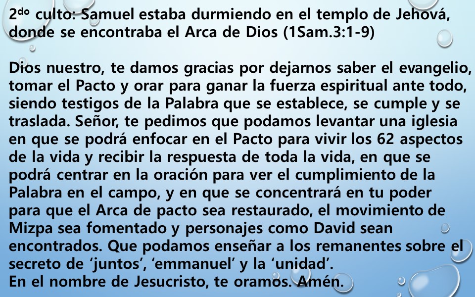 | 2do culto: Samuel estaba durmiendo en el templo de Jehová, donde se encontraba el Arca de Dios (1Sam.3:1-9) |