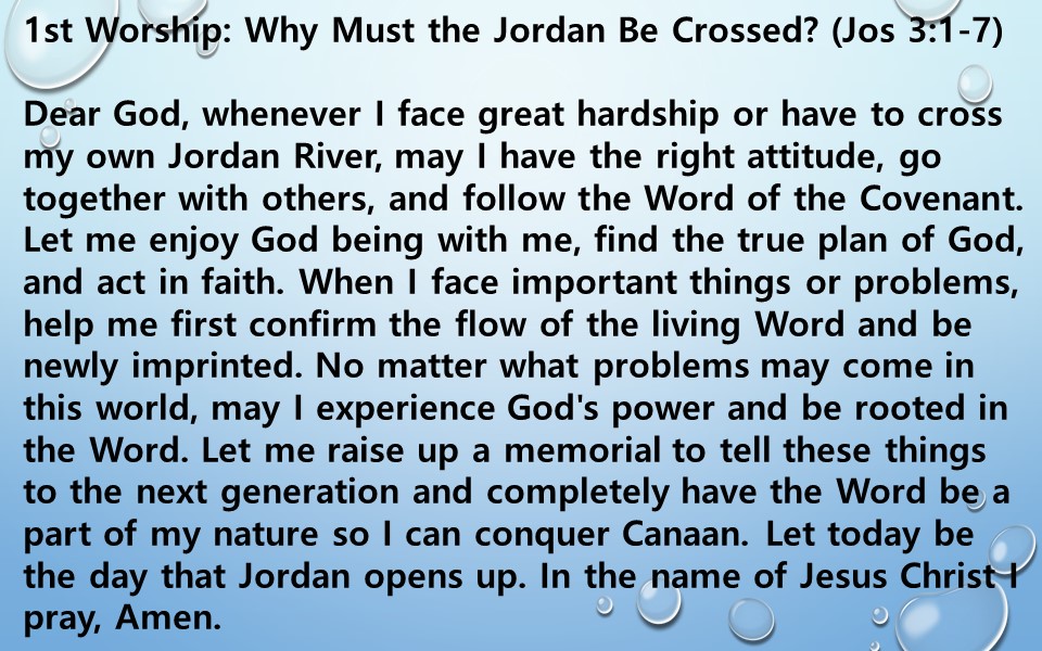 Dear God, whenever I face great hardship or have to cross my own Jordan River, may I have the right attitude, go together with others, and follow the Word of the Covenant. Let me enjoy God being with me, find the true plan of God, and act in faith. When I face important things or problems, help me first confirm the flow of the living Word and be newly imprinted. No matter what problems may come in this world, may I experience God's power and be rooted in the Word. Let me raise up a memorial to tell these things to the next generation and completely have the Word be a part of my nature so I can conquer Canaan. Let today be the day that Jordan opens up. In the name of Jesus Christ I pray, Amen.