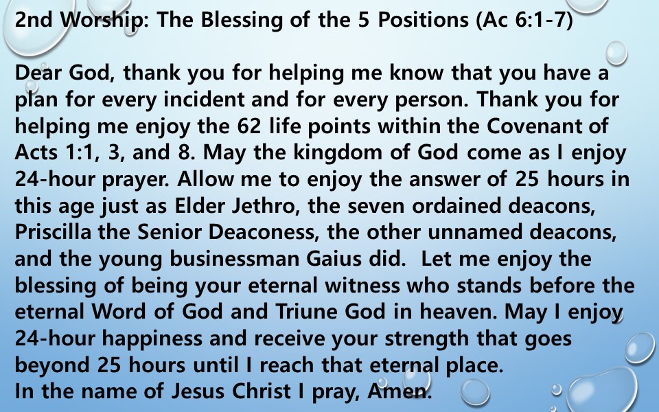 Dear God, thank you for helping me know that you have a plan for every incident and for every person. Thank you for helping me enjoy the 62 life points within the Covenant of Acts 1:1, 3, and 8. May the kingdom of God come as I enjoy 24-hour prayer. Allow me to enjoy the answer of 25 hours in this age just as Elder Jethro, the seven ordained deacons, Priscilla the Senior Deaconess, the other unnamed deacons, and the young businessman Gaius did.  Let me enjoy the blessing of being your eternal witness who stands before the eternal Word of God and Triune God in heaven. May I enjoy 24-hour happiness and receive your strength that goes beyond 25 hours until I reach that eternal place. In the name of Jesus Christ I pray, Amen.