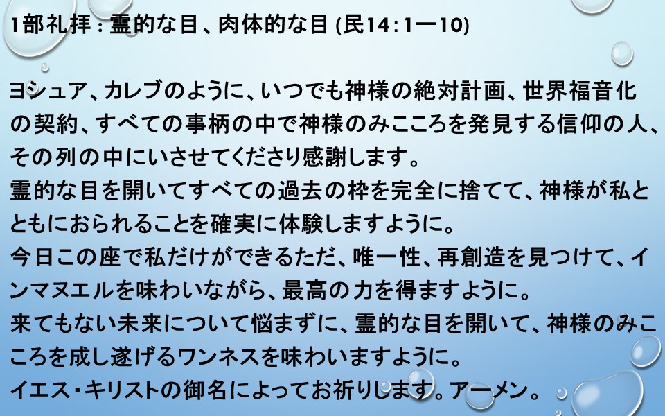 ヨシュア、カレブのように、いつでも神様の絶対計画、世界福音化の契約、すべての事柄の中で神様のみこころを発見する信仰の人、その列の中にいさせてくださり感謝します。