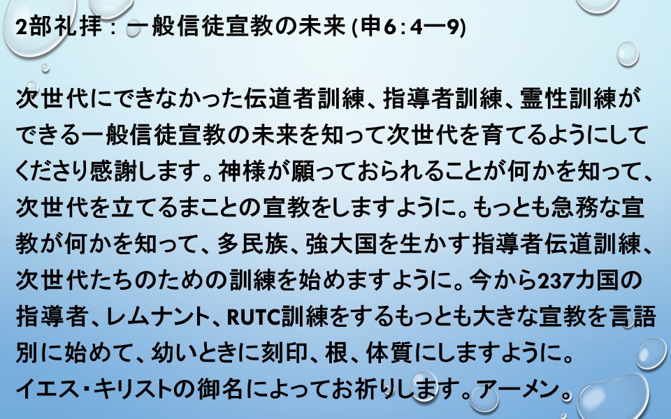 次世代にできなかった伝道者訓練、指導者訓練、霊性訓練ができる一般信徒宣教の未来を知って次世代を育てるようにしてくださり感謝します。神様が願っておられることが何かを知って、次世代を立てるまことの宣教をしますように。もっとも急務な宣教が何かを知って、多民族、強大国を生かす指導者伝道訓練、次世代たちのための訓練を始めますように。今から237カ国の指導者、レムナント、RUTC訓練をするもっとも大きな宣教を言語別に始めて、幼いときに刻印、根、体質にしますように。