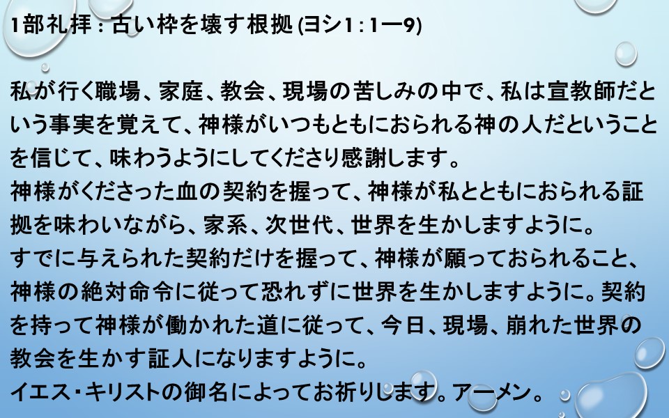 私が行く職場、家庭、教会、現場の苦しみの中で、私は宣教師だという事実を覚えて、神様がいつもともにおられる神の人だということを信じて、味わうようにしてくださり感謝します。