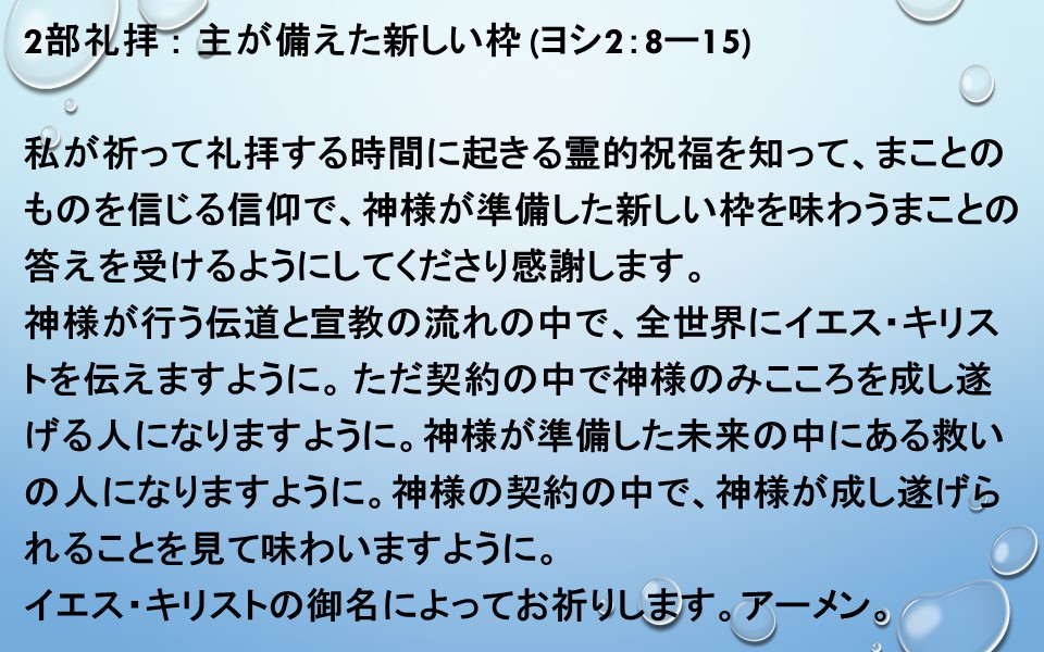 私が祈って礼拝する時間に起きる霊的祝福を知って、まことのものを信じる信仰で、神様が準備した新しい枠を味わうまことの答えを受けるようにしてくださり感謝します。