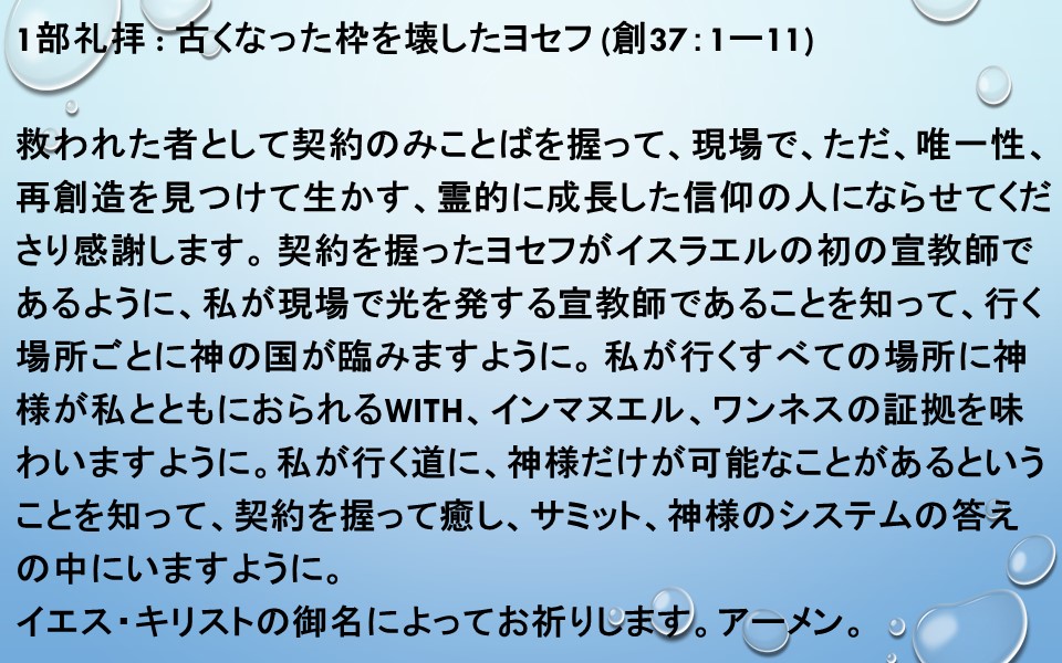 契約を握ったヨセフがイスラエルの初の宣教師であるように、私が現場で光を発する宣教師であることを知って、行く場所ごとに神の国が臨みますように。