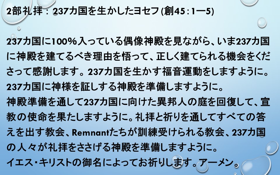 神殿準備を通して237カ国に向けた異邦人の庭を回復して、宣教の使命を果たしますように。礼拝と祈りを通してすべての答えを出す教会、Remnantたちが訓練受けられる教会、237カ国の人々が礼拝をささげる神殿を準備しますように。