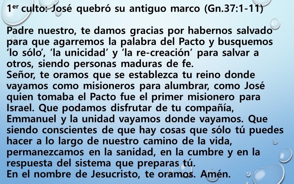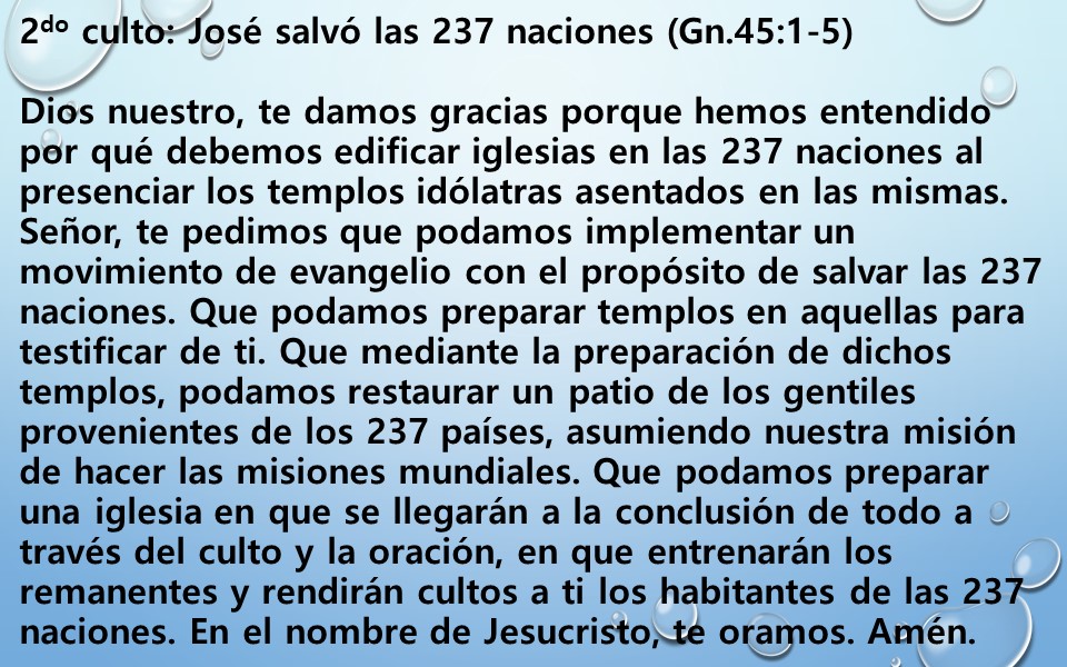 Señor, te pedimos que podamos implementar un movimiento de evangelio con el propósito de salvar las 237 naciones. Que podamos preparar templos en aquellas para testificar de ti. Que mediante la preparación de dichos templos, podamos restaurar un patio de los gentiles provenientes de los 237 países, asumiendo nuestra misión de hacer las misiones mundiales. Que podamos preparar una iglesia en que se llegarán a la conclusión de todo a través del culto y la oración, en que entrenarán los remanentes y rendirán cultos a ti los habitantes de las 237 naciones.