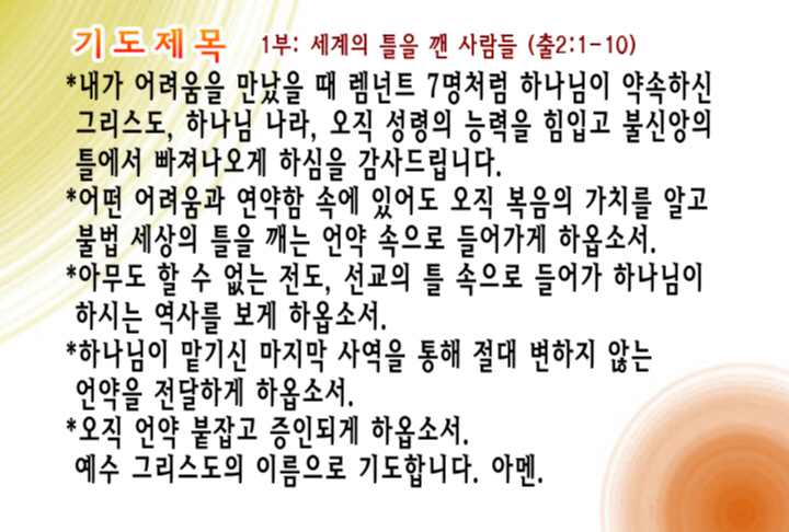 내가 어려움을 만났을 때 렘넌트 7명처럼 하나님이 약속하신 그리스도, 하나님 나라, 오직 성령의 능력을 힘입고 불신앙의 틀에서 빠져나오게 하심을 감사드립니다.어떤 어려움과 연약함 속에 있어도 오직 복음의 가치를 알고 불법 세상의 틀을 깨는 언약속으로 들어가게 하옵소서. 아무도 할 수 없는 전도, 선교의 틀속으로 들어가 하나님이 하시는 역사를 보게 하옵소서. 하나님이 맡기신 마지막 사역을 통해 절대 변하지 않는 언약을 전달하게 하옵소서. 오직 언약 붙잡고 증인되게 하옵소서.
