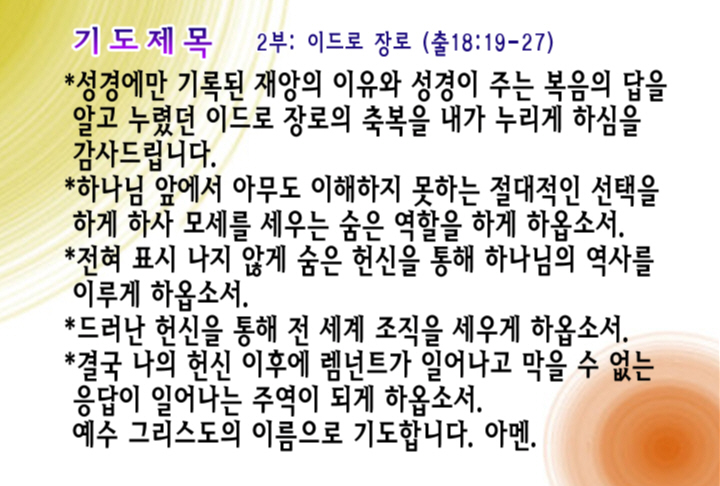 성경에만 기록된 재앙의 이유와 성경이 주는 복음의 답을 알고 누렸던 이드로 장로의 축복을 내가 누리게 하심을 감사드립니다. 하나님 앞에서 아무도 이해하지 못하는 절대적인 선택을 하게 하사 모세를 세우는 숨은 역할을 하게 하옵소서. 전혀 표시 나지 않게 숨은 헌신을 통해 하나님의 역사를 이루게 하옵소서. 드러난 헌신을 통해 전 세계 조직을 세우게 하옵소서. 결국 나의 헌신 이후에 렘넌트가 일어나고 막을 수 없는 응답이 일어나는 주역이 되게 하옵소서.