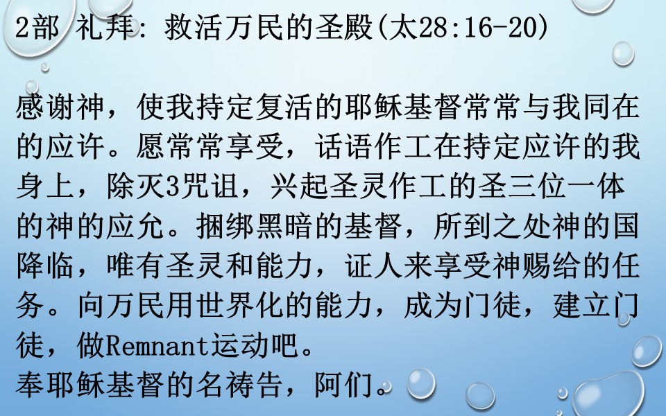 感谢神,使我持定复活的耶稣基督常常与我同在的应许。愿常常享受,话语作工在持定应许的我身上,除灭3咒诅,兴起圣灵作工的圣三位一体的神的应允。捆绑黑暗的基督,所到之处神的国降临,唯有圣灵和能力,证人来享受神赐给的任务。向万民用世界化的能力,成为门徒,建立门徒,做Remnant运动吧。