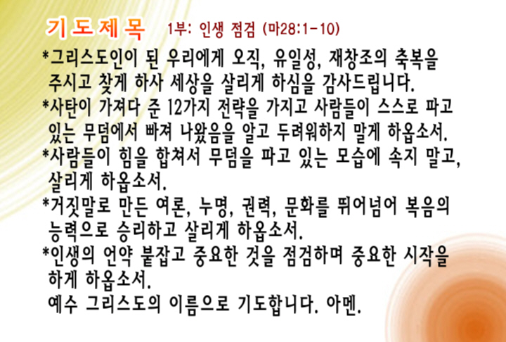 그리스도인이 된 우리에게 오직, 유일성, 재창조의 축복을 주시고 찾게 하사 세상을 살리게 하심을 감사드립니다. 사탄이 가져다 준 12가지 전략을 가지고 사람들이 스스로 파고 있는 무덤에서 빠져 나왔음을 알고 두려워하지 말게 하옵소서. 사람들이 힘을 합쳐서 무덤을 파고 있는 모습에 속지 말고, 살리게 하옵소서.