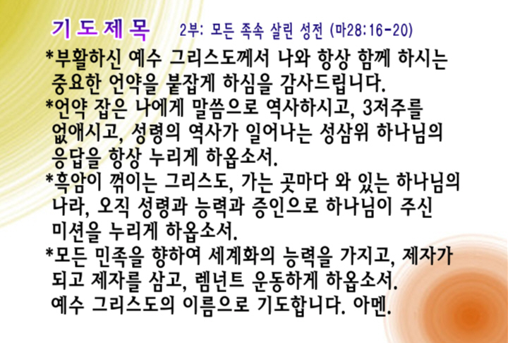 모든 민족을 향하여 세계화의 능력을 가지고, 제자가 되고 제자를 삼고, 렘넌트 운동하게 하옵소서.