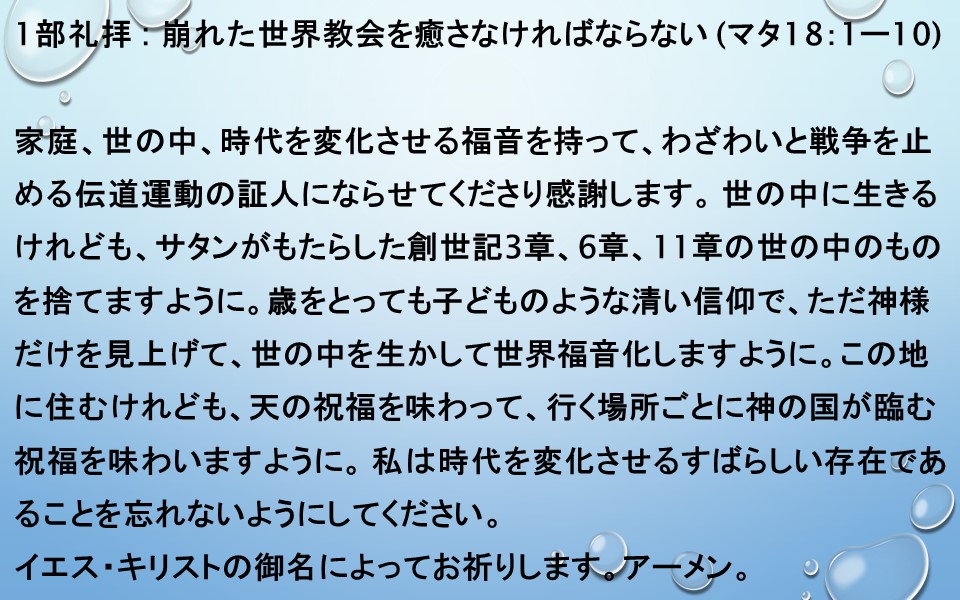 世の中に生きるけれども、サタンがもたらした創世記3章、6章、11章の世の中のものを捨てますように。歳をとっても子どものような清い信仰で、ただ神様だけを見上げて、世の中を生かして世界福音化しますように。この地に住むけれども、天の祝福を味わって、行く場所ごとに神の国が臨む祝福を味わいますように。