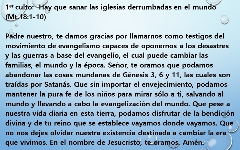 Señor, te oramos que podamos abandonar las cosas mundanas de Génesis 3, 6 y 11, las cuales son traídas por Satanás. Que sin importar el envejecimiento, podamos mantener la pura fe de los niños para mirar sólo a ti, salvando al mundo y llevando a cabo la evangelización del mundo. Que pese a nuestra vida diaria en esta tierra, podamos disfrutar de la bendición divina y de tu reino que se establece vayamos donde vayamos. Que no nos dejes olvidar nuestra existencia destinada a cambiar la era que vivimos.