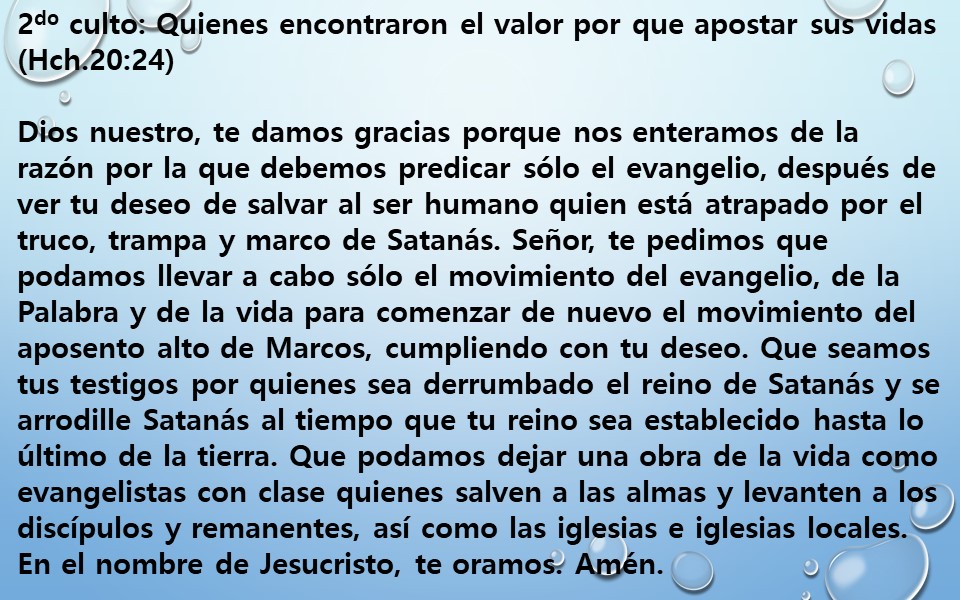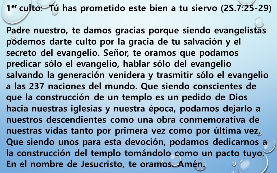 Padre nuestro, te damos gracias porque siendo evangelistas podemos darte culto por la gracia de tu salvación y el secreto del evangelio. Señor, te oramos que podamos predicar sólo el evangelio, hablar sólo del evangelio salvando la generación venidera y trasmitir sólo el evangelio a las 237 naciones del mundo. Que siendo conscientes de que la construcción de un templo es un pedido de Dios hacia nuestras iglesias y nuestra época, podamos dejarlo a nuestros descendientes como una obra conmemorativa de nuestras vidas tanto por primera vez como por última vez.