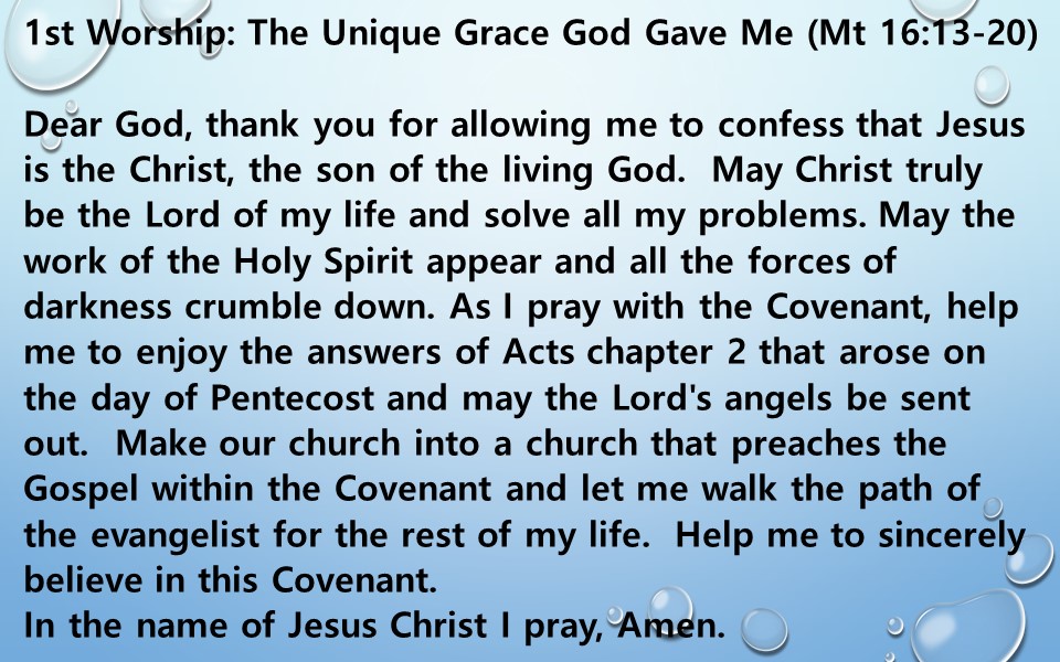 Dear God, thank you for allowing me to confess that Jesus is the Christ, the son of the living God.  May Christ truly be the Lord of my life and solve all my problems. May the work of the Holy Spirit appear and all the forces of darkness crumble down. As I pray with the Covenant, help me to enjoy the answers of Acts chapter 2 that arose on the day of Pentecost and may the Lord's angels be sent out.  Make our church into a church that preaches the Gospel within the Covenant and let me walk the path of the evangelist for the rest of my life.  Help me to sincerely believe in this Covenant. In the name of Jesus Christ I pray, Amen.