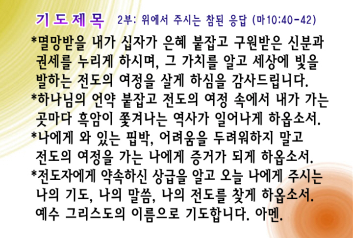 전도자에게 약속하신 상급을 알고 오늘 나에게 주시는 나의 기도, 나의 말씀, 나의 전도를 찾게 하옵소서.