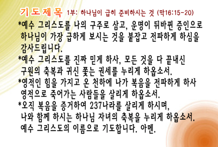 오직 복음을 증거하여 237나라를 살리게 하시며, 나와 함께 하시는 하나님 자녀의 축복을 누리게 하옵소서.