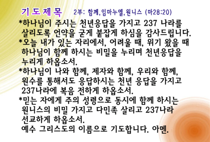 오늘 내가 있는 자리에서, 어려울 때, 위기 왔을 때 하나님이 함께 하시는 비밀을 누리며 천년응답을 누리게 하옵소서. 하나님이 나와 함께, 제자와 함께, 우리와 함께, 원수를 통해서도 응답하시는 천년 응답을 가지고 237나라에 복음 전하게 하옵소서. 믿는 자에게 주의 성령으로 동시에 함께 하시는 원니스의 비밀 가지고 다민족 살리고 237나라 선교하게 하옵소서.