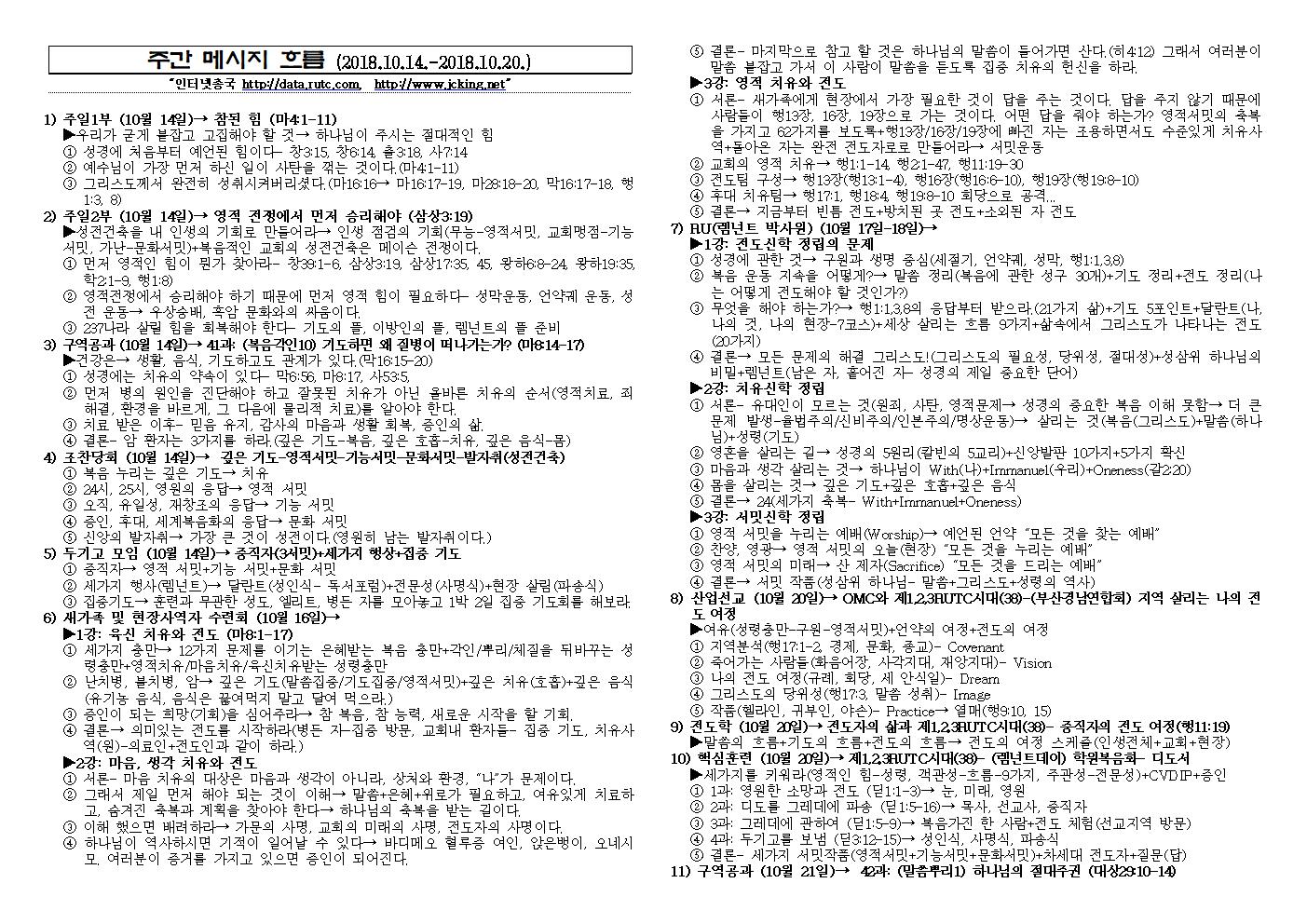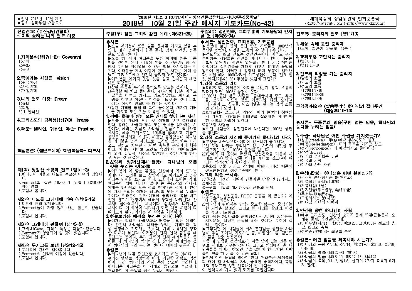2018년 10월 21일 주일예배 메시지 기도카드