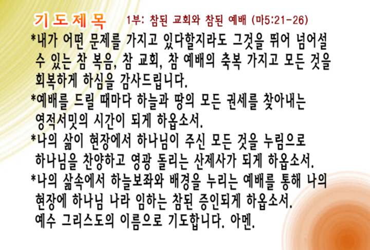 1부 예배: 참된 교회와 참된 예배 (마5:21-26)