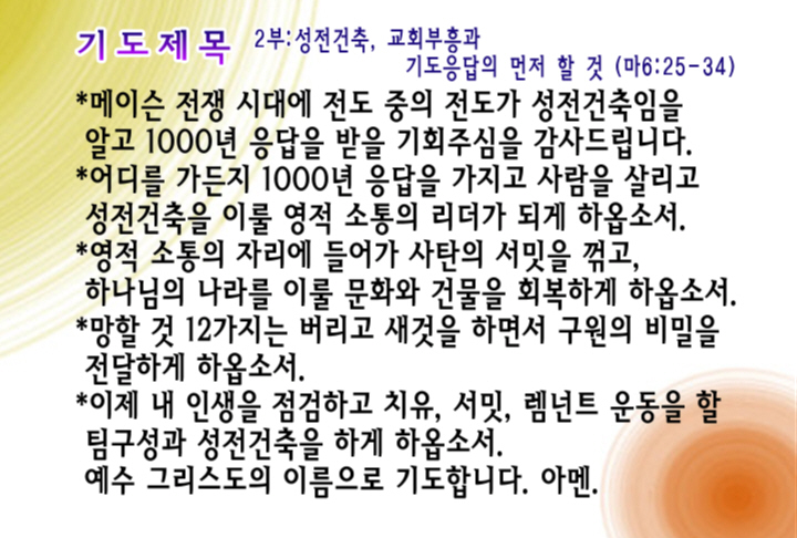 2부 예배: 성전건축, 교회부흥과 기도응답의 먼저 할 것(마6:25-34)